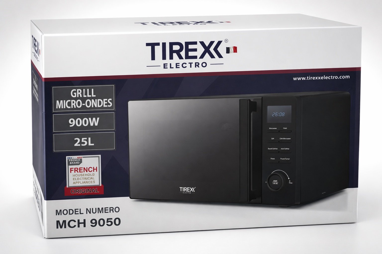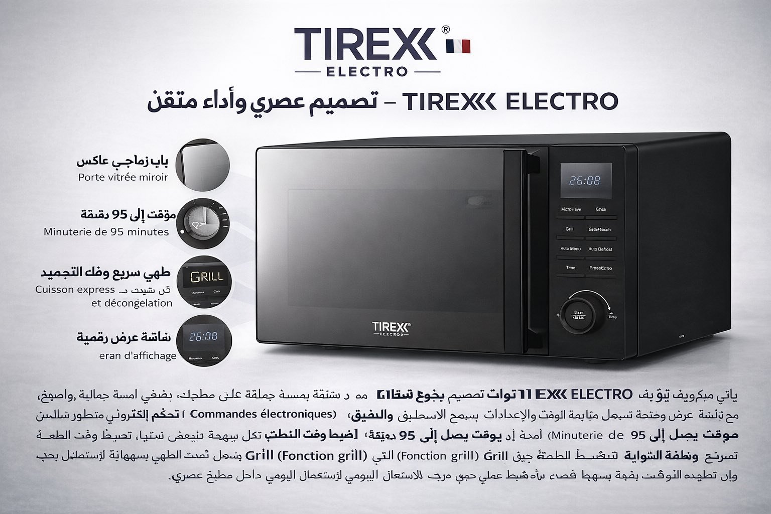 يأتي ميكروويف TIREXX ELECTRO بتصميم عصري وأنيق مزود بـ باب زجاجي عاكس (Porte vitrée miroir) يضفي لمسة جمالية على المطبخ، مع شاشة عرض رقمية واضحة تسهّل متابعة الوقت والإعدادات. يحتوي على تحكم إلكتروني متطور (Commandes électroniques) يسمح بالاستعمال السلس والدقيق، إضافة إلى مؤقت يصل إلى 95 دقيقة (Minuterie de 95 minutes) لضبط وقت الطهي بكل سهولة. يوفر الجهاز الطهي السريع وفك التجميد (Cuisson express et décongélation) لتوفير الوقت، إلى جانب وظيفة الشواية Grill (Fonction grill) التي تمنح الأطعمة تحميرًا مثالياً. كما يتميز بـ مقبض باب عملي وسهل السحب (Poignée de porte facile à tirer) وإمكانية ضبط وقت الطهي بسهولة (Réglage facile du temps de cuisson)، ما يجعله خيارًا عمليًا ومريحًا للاستعمال اليومي داخل كل مطبخ عصري